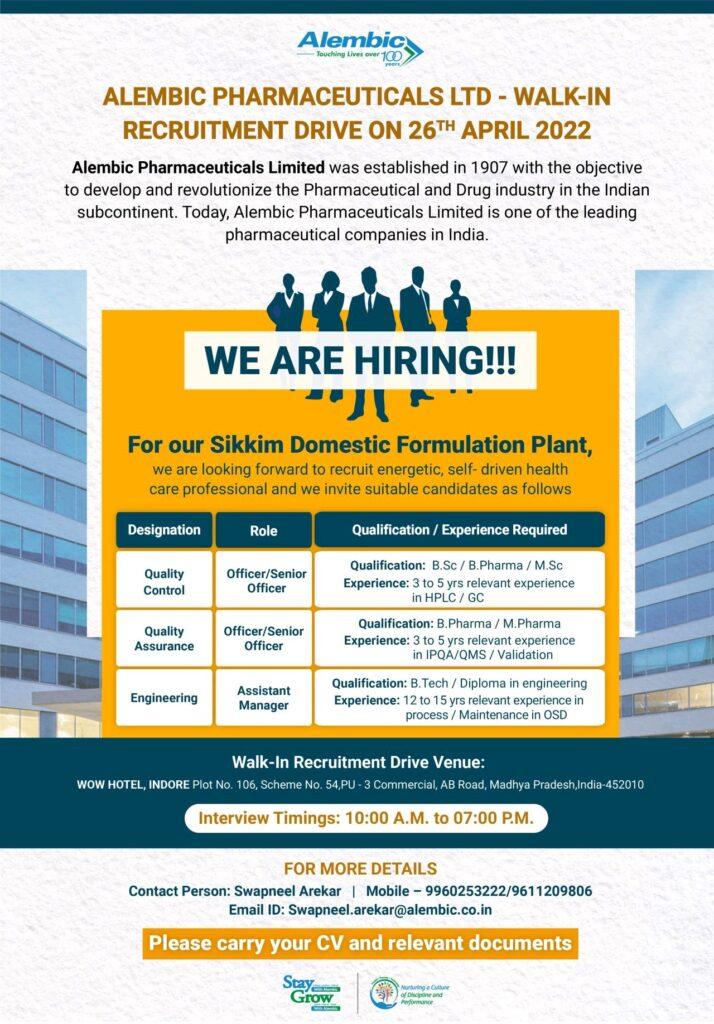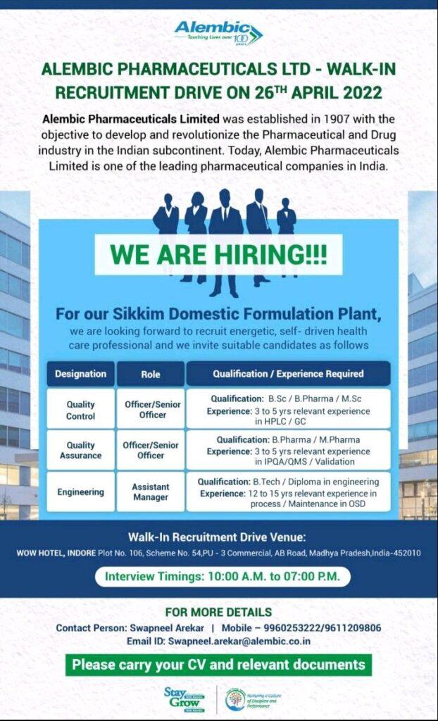 ALEMBIC PHARMACEUTICALS LTD-WALK-IN RECRUITMENT DRIVE ON 26TH APRIL 2022