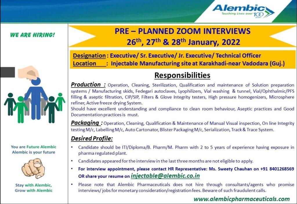 ALEMBIC PHARMACEUTICALS LIMITED, Pre- Planned ZOOM Interview on 26th, 27th & 28th January, 2022