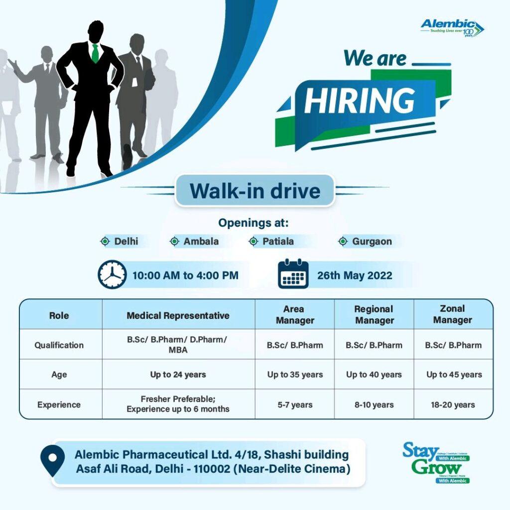 Alembic Pharmaceuticals Walk In Drive for Medical Representative, Area Manager, Regional Manager & Zonal Manager on 26th May 2022 – Freshers & experience