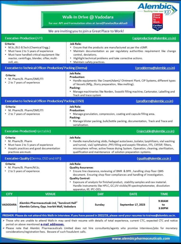 FRESHER: Please do not attend this Walk-in interview. If you have passed in 2022/23, please send your resumes to trainee@alembic.co.in .