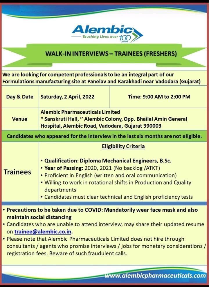 • Candidates who are unable to attend interview, may share their updated resume on trainee@alembic.co.in.
