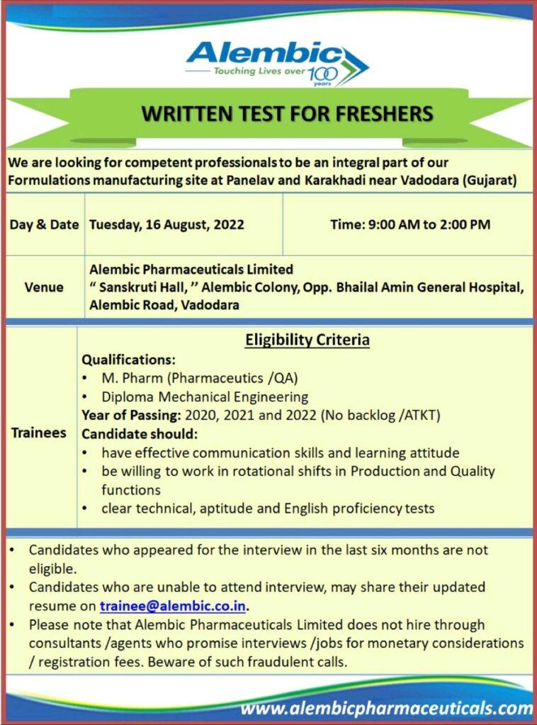Written Test for Freshers M.Pharm (Pharmaceutics and QA) and Diploma Mechanical Engg.Batch – 2020, 2021 and 2022 organized by Alembic Pharmaceuticals Limited on August 16,2022 Tuesday for its Production, Quality functions for Panelav and Karakhadi site near Vadodara. ( Guj.)