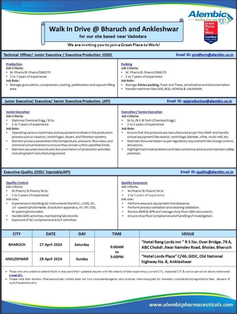 Alembic Walk In Drive @ Bharuch and Ankleshwar on 27th & 28th April 2024