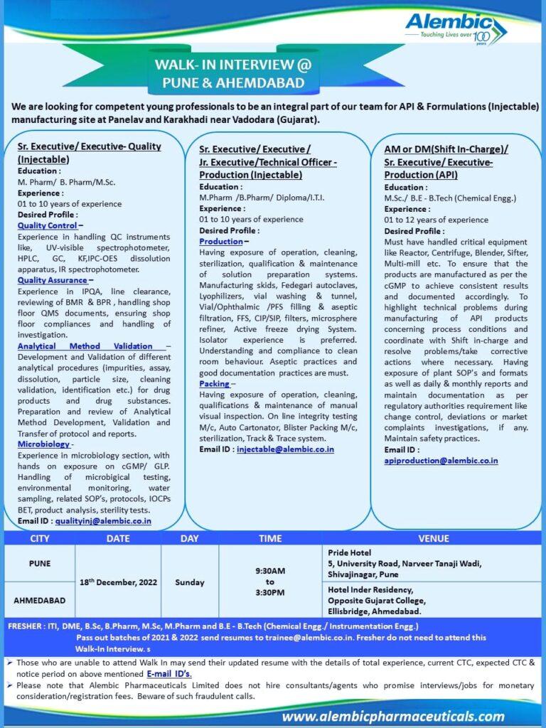 Alembic – Walk In Interview for Multiple opening in API & Formulations on 18th December, 2022 at PUNE & AHEMDABAD