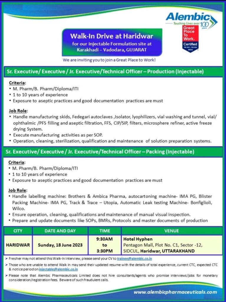Those who are unable to attend Walk in may send their updated resume with the details of total experience, current CTC, expected CTC & notice period on injectable@alembic.co.in