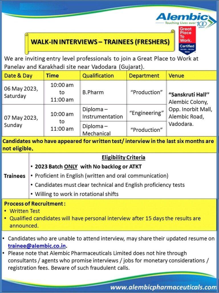 Walk-In Interviews for Freshers – B. Pharm . (2023 batch only) on 06.05.2023(Saturday) and Diploma – Mechanical & Instrumentation (2023 batch only) on 07.05.2023 (Sunday) at Vadodara organised by Alembic Pharmaceutical Limited for its manufacturing sites based at Panelav and Karakhadi near Vadodara