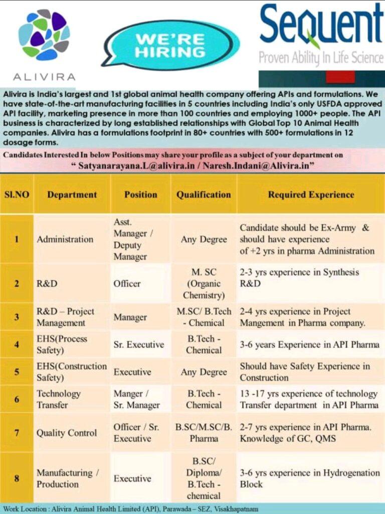 Alivira hiring for Administration, R&D, R&D Project Management, EHS(Process Safety), EHS(Construction Safety), Technology Transfer, Quality Control, Manufacturing/ Production
