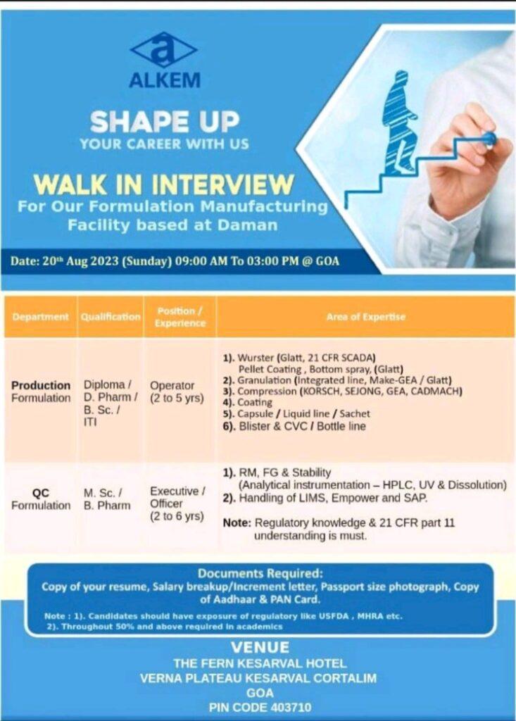 Alkem Laboratories Limited Walk In Drive on 20th Aug 2023 | For Formulation Manufacturing Facility based at Daman