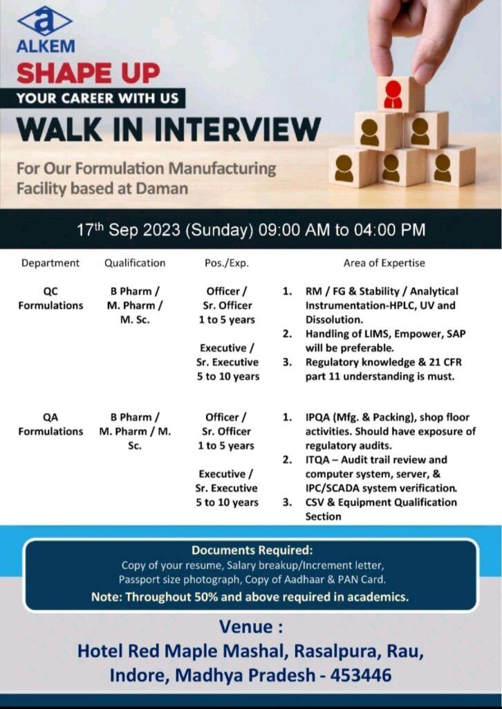 Alkem Laboratories Walk In Drive on 17th Sep 2023 (Sunday)for Quality Control & Quality Assurance department
