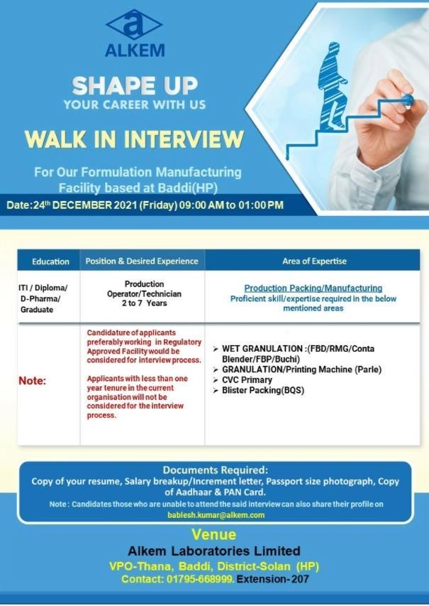 Alkem Laboratories Limited is an Indian multinational pharmaceutical company headquartered in Mumbai, Maharashtra, India that manufactures and sells pharmaceutical generics, formulations and nutraceuticals in India and globally. Alkem Laboratories Ltd Conducting Walk-In Interview for Our Formulation Manufacturing Facility based at Baddi (HP).