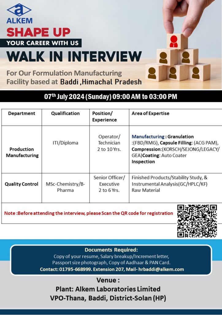 Alkem Laboratories walk in interview for Production Manufacturing & Quality Control on 07th July 2024 (Sunday)