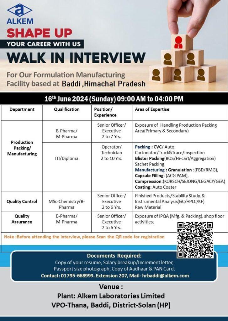 Alkem Laboratories walk in interview for Production Packing/ Manufacturing, Qa, QC on 16th June 2024 (Sunday)