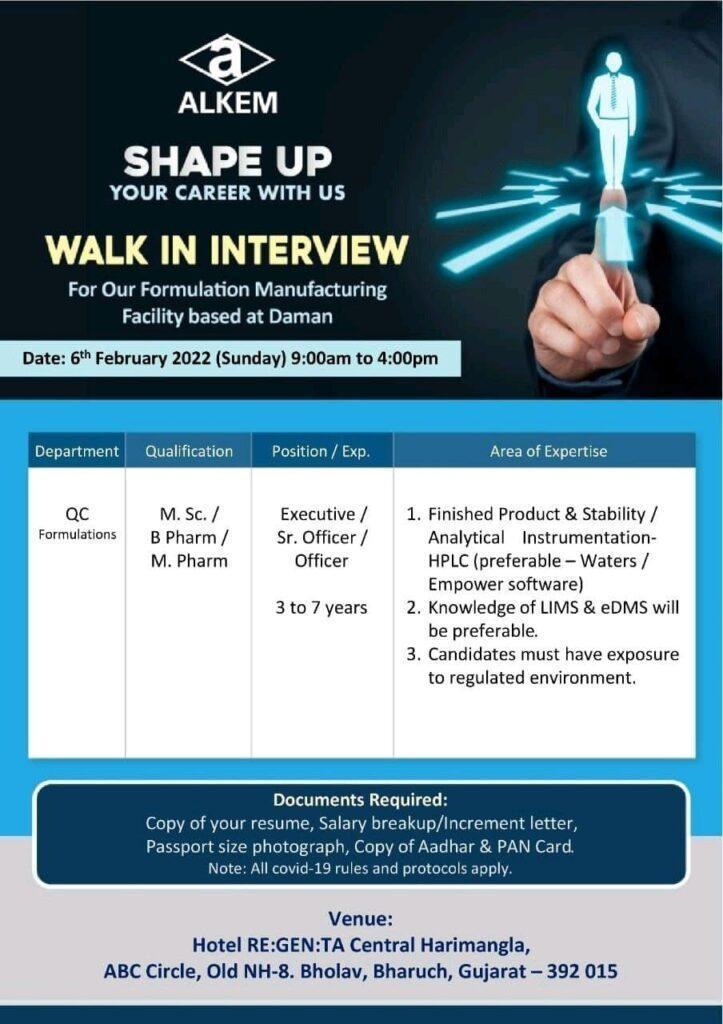 Alkem : Walk-In-Interview for experienced M.Sc/ B.Pharm/ M.Pharm professionals for QC Formulation Department at Daman on 6th February, 2022