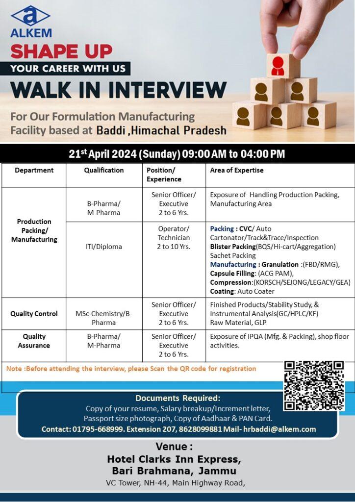ALKEM walk in interview for Formulation Manufacturing Facility based at Baddi, Himachal Pradesh on 21st April 2024 (Sunday)