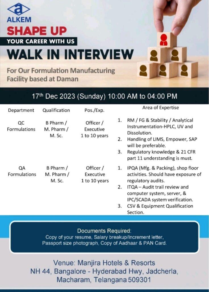 ALKEM walk in interview for Manufacturing Facility based at Daman on 17th Dec 2023 (Sunday) | Interview at Jadcherla, Macharam, Telangana
