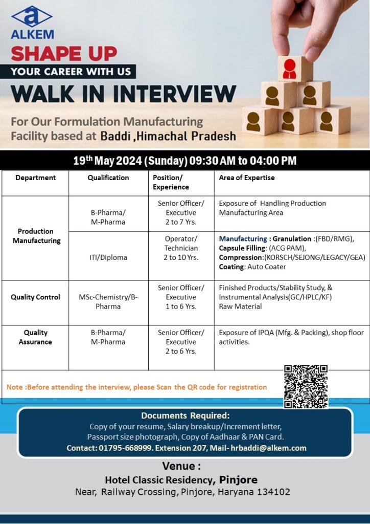 ALKEM walk in interview for Production Manufacturing, Quality Control, Quality Assurance on 19th May 2024 (Sunday)