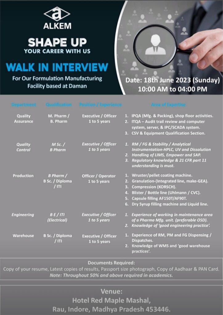 ALKEM Walk in interview for QA, QC, Production, Engineering, Warehouse department on 18th June 2023 (Sunday)