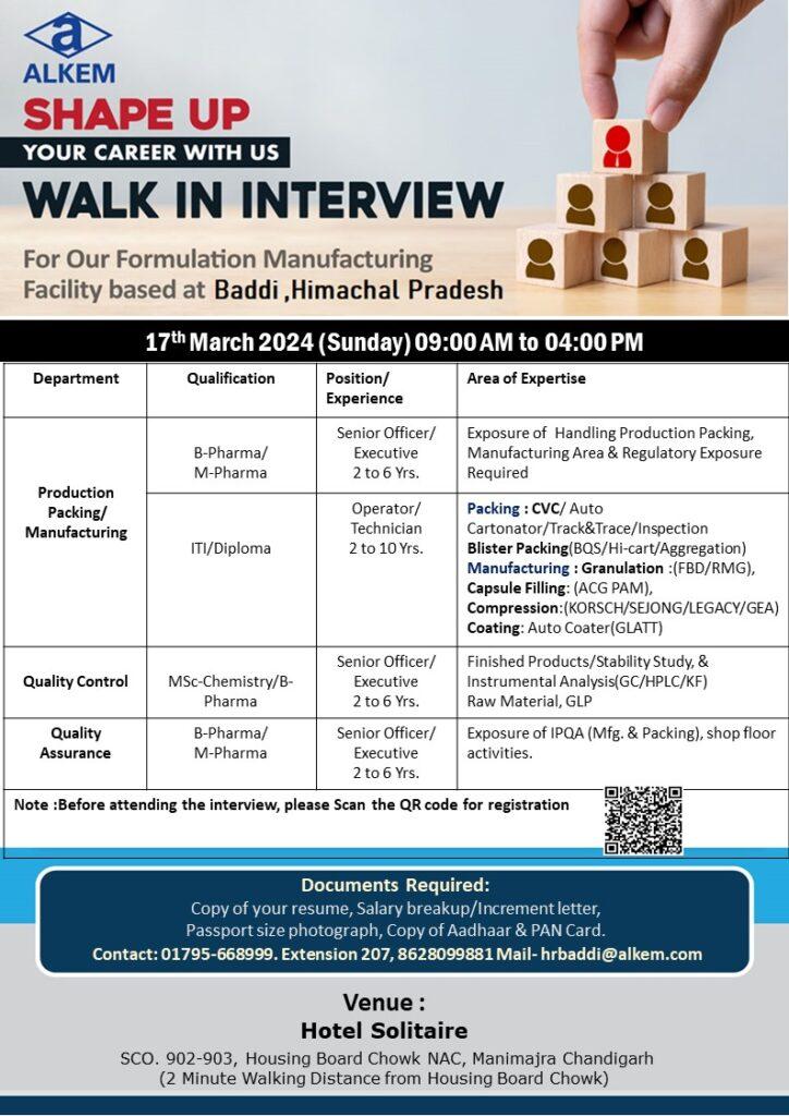 ALKEM walk in interview for QA, QC, Production & Packing on 17th March 2024 (Sunday)