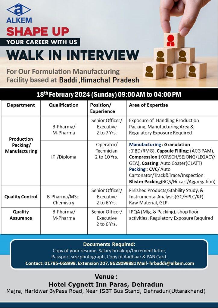 ALKEM walk in interview for Formulation Manufacturing Facility based at Baddi, Himachal Pradesh on 18th February 2024 (Sunday)