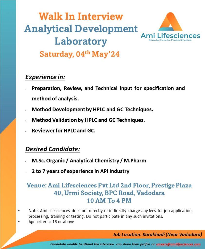 Ami Lifesciences is inviting candidates for a Walk-In Interview for its R&D Center at Karakhadi (Near Vadodara)
