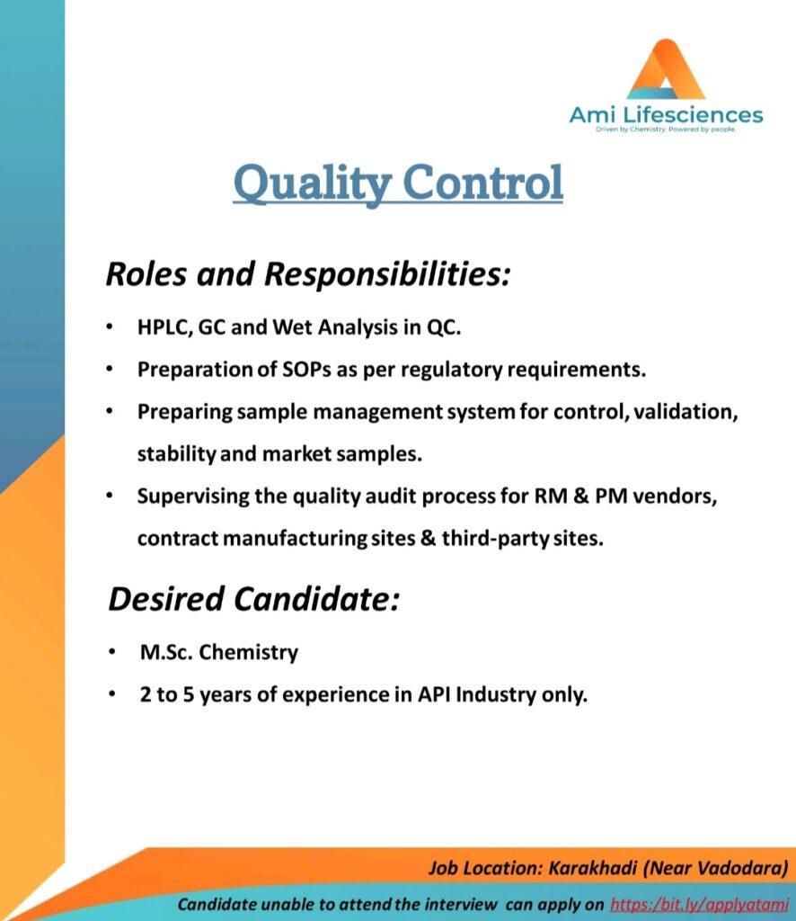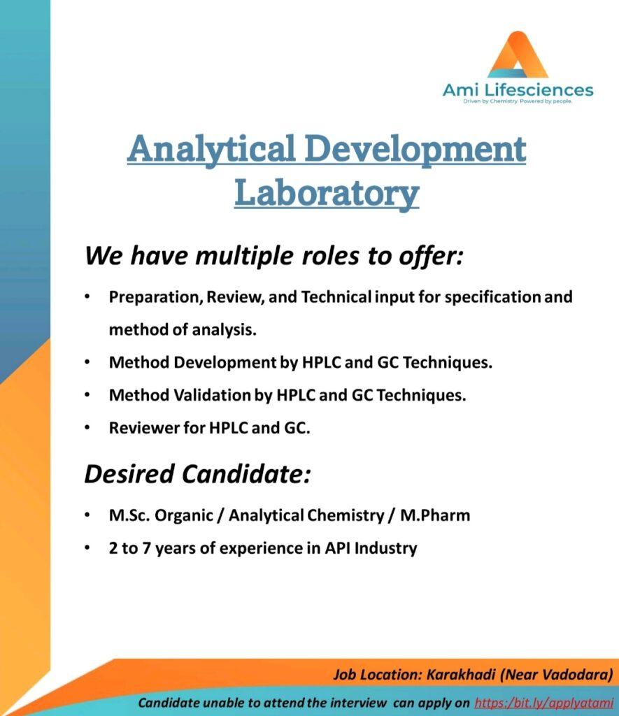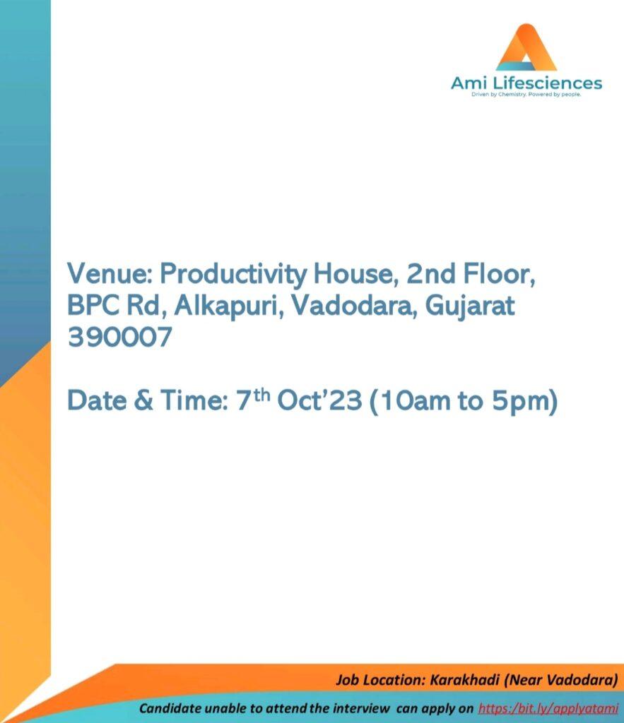 Ami Lifesciences is inviting candidates for a walk-in interview for multiple openings at its Karakhadi site on 7th Oct’23