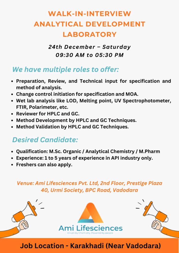 Ami Lifesciences Pvt. Ltd. Walk-In Interview at Vadodara on 24/12/22