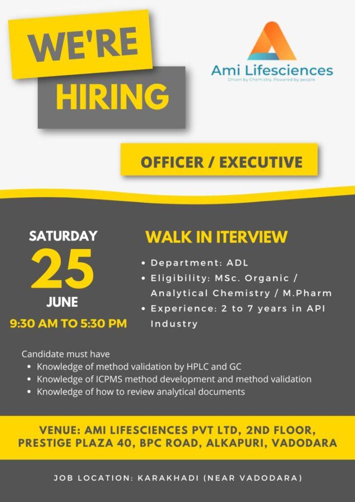 Walk-In Interview Vadodara – Ami Lifesciences Pvt. Ltd. “A fast-growing API company, offers career opportunities to young professionals at their Karakhadi plant near Vadodara.”