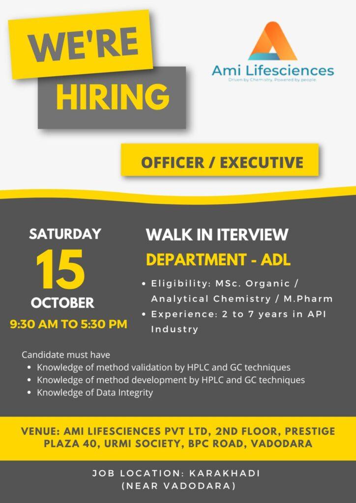 Walk-In Interview Vadodara – Ami Lifesciences Pvt. Ltd. “A fast-growing API company, offers career opportunities to young professionals at their Karakhadi plant near Vadodara.”