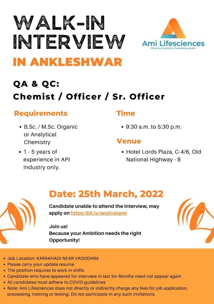 Ami Lifesciences Pvt. Ltd Walk-In Interview for QA & QC Chemist / Officer / Sr. Officer on 25th March 2022 at Ankleshwar