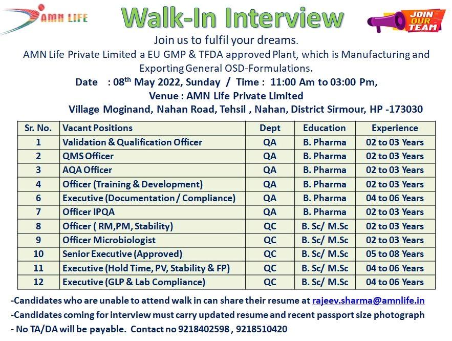 AMN LIFE Walk-In Interview for multiple position in QA & QC department on 08th May 2022, Sunday