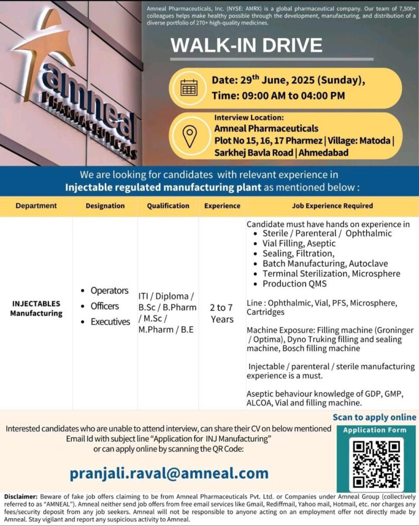 Email Id with subject line “Application for INJ Manufacturing” or can apply online by