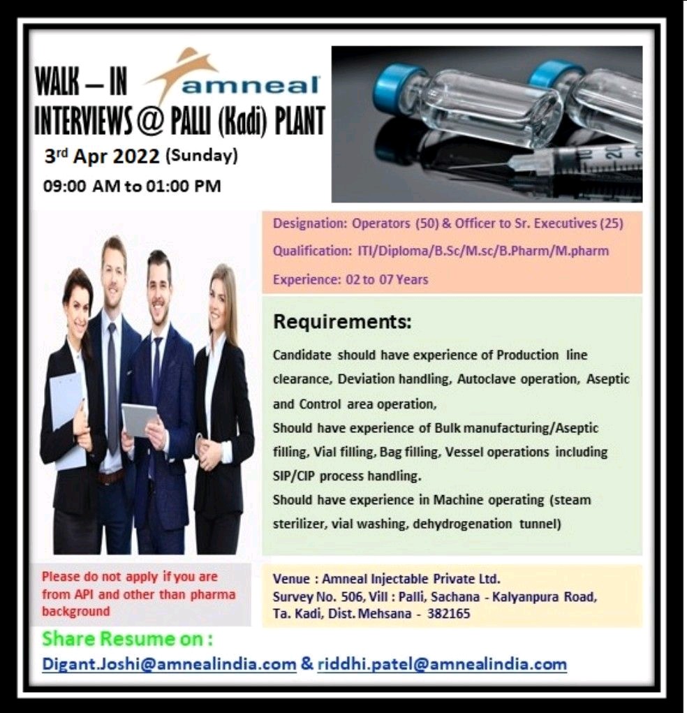 Amneal Injectable Private Ltd. WALK-IN INTERVIEWS@PALLI (Kadi) PLANT on 3rd Apr 2022