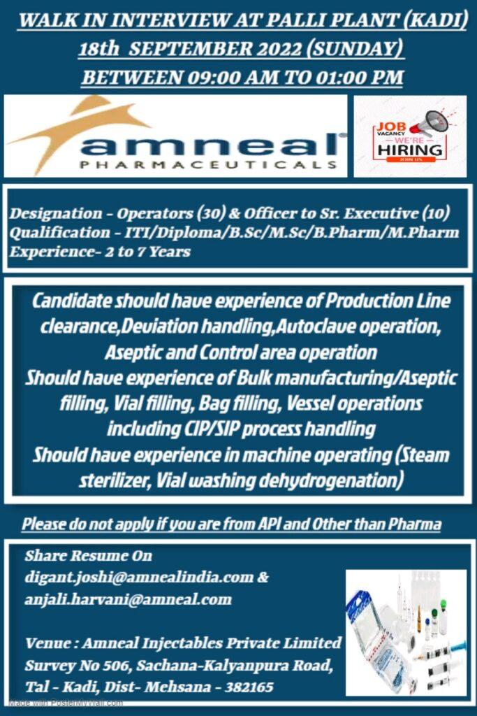 Amneal Injectables Private Limited Walk In Interview for Operators (30) & Officer to Sr. Executive (10) on 18th September 2022