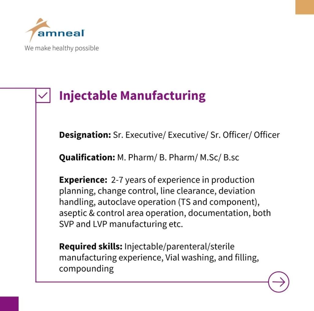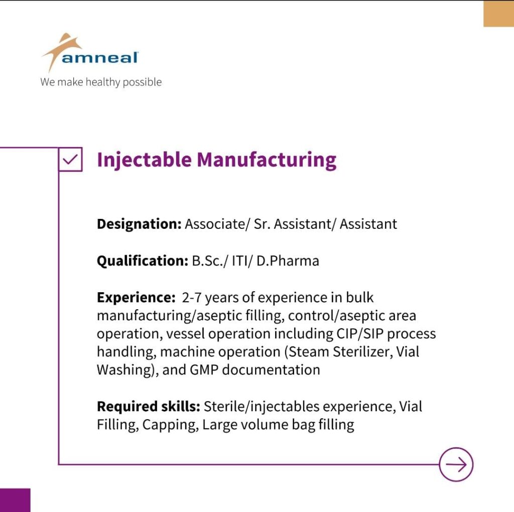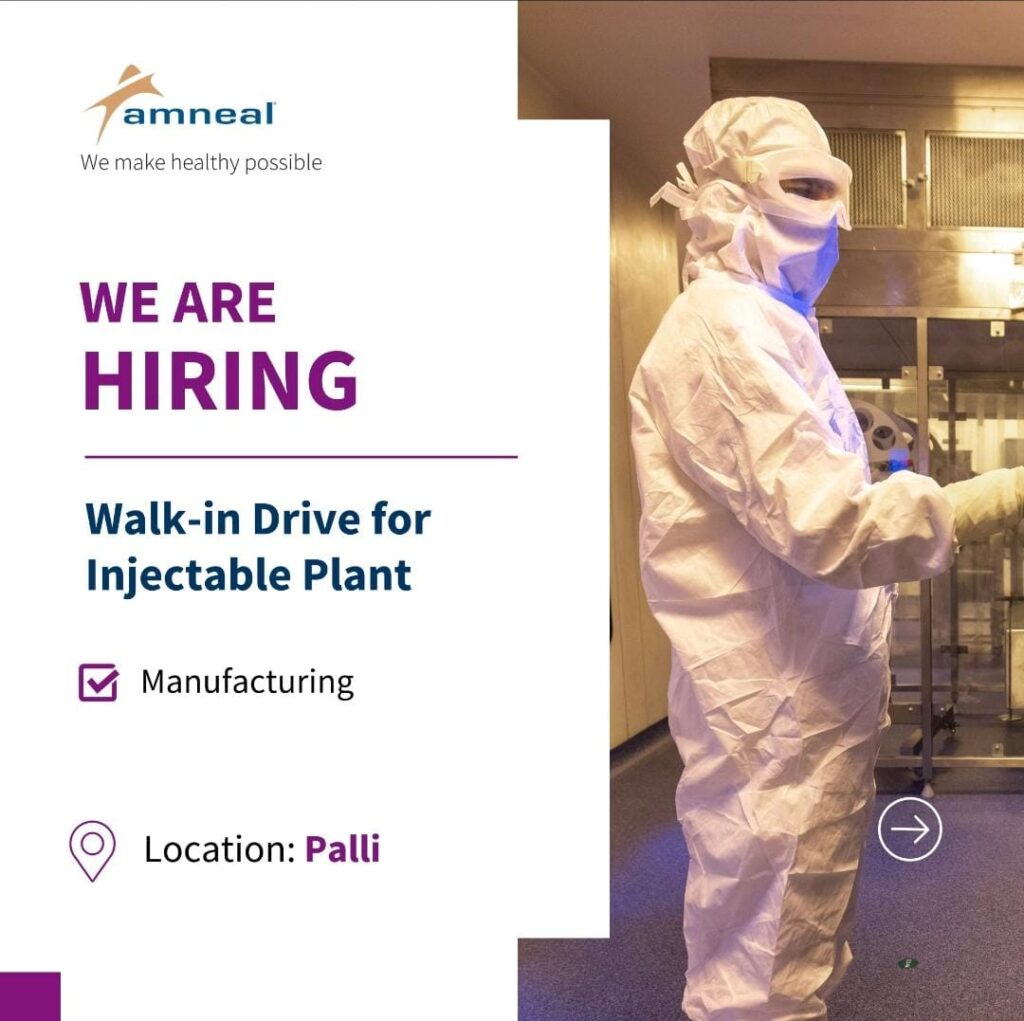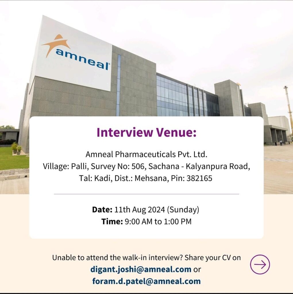 Unable to attend the walk-in interview? Share your CV on digant.joshi@amneal.com or foram.d.patel@amneal.com