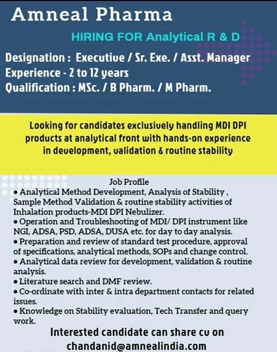 Looking for candidates exclusively handling MDI DPI products at analytical front with hands-on experience in development, validation & routine stability