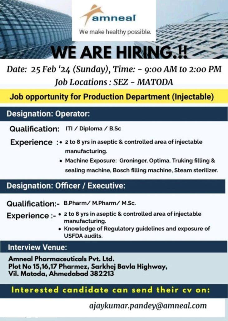 Interview Venue: Amneal Pharmaceuticals Pvt. Ltd. Plot No 15,16,17 Pharmez, Sarkhej Bavla Highway, Vil. Matoda, Ahmedabad 382213