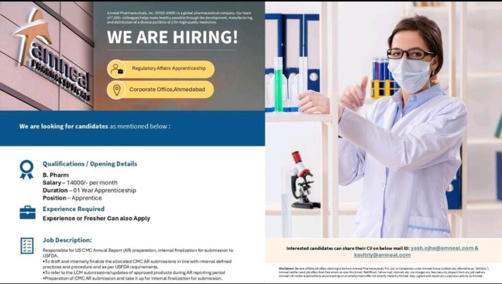 Interested candidates can share their CV on below mail ID: yash.ojha@amneal.com.&