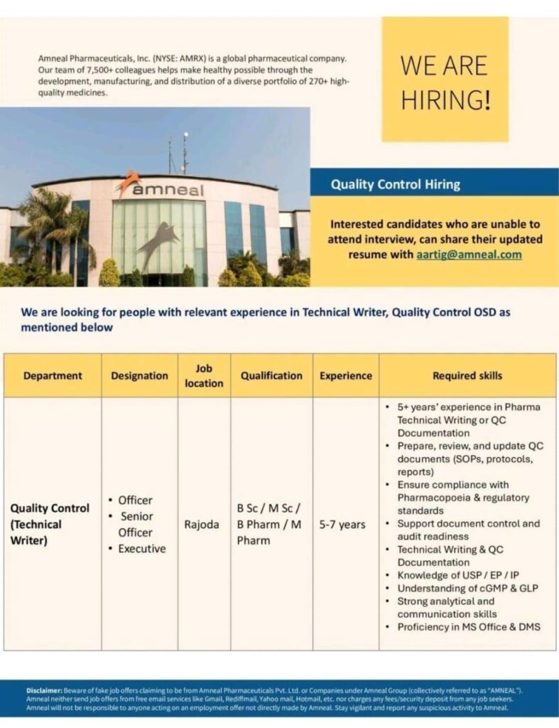 Amneal Pharmaceuticals, a globally recognized pharmaceutical company with over 7,500 employees, has announced new job openings in its Quality Control (QC) department. The organization is seeking skilled professionals with strong expertise in Pharma Technical Writing and QC Documentation for positions based in Rajoda.