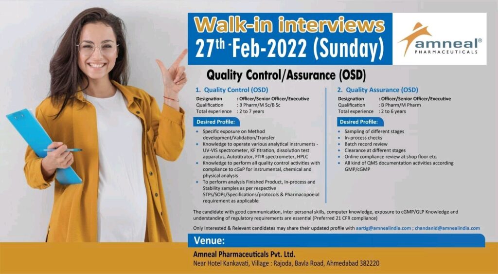 Amneal Pharmaceuticals” Walk-In-Interview for experienced candidates for Quality Control/ Quality Assurance department at Ahmedabad on 27th February, 2022.