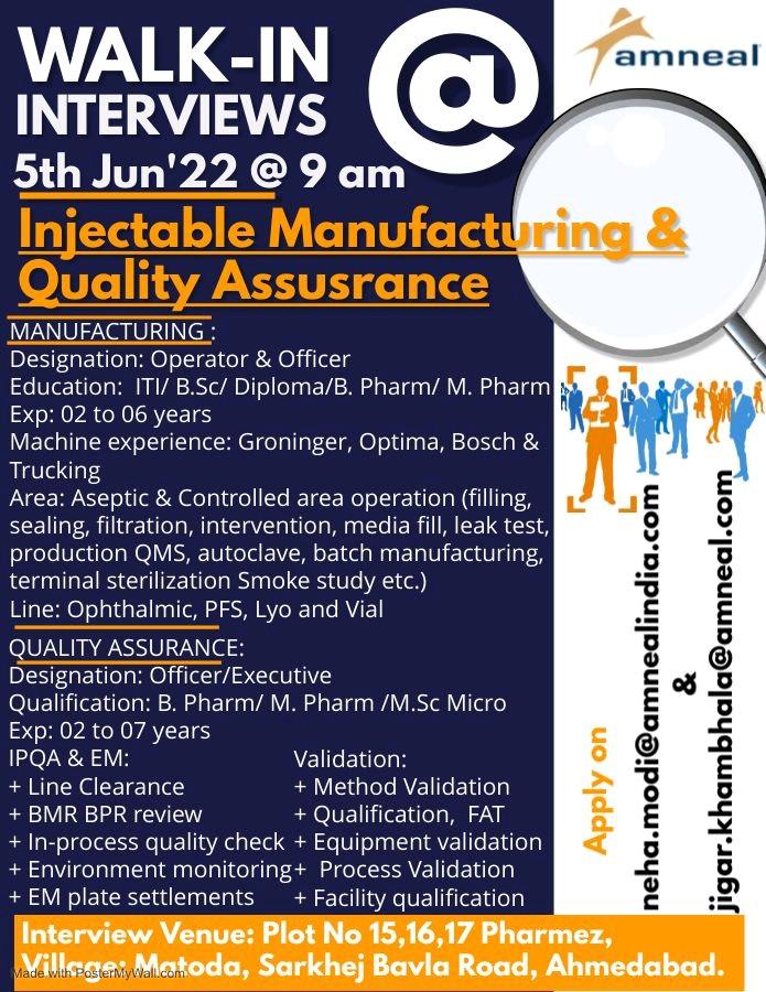 Amneal Pharmaceuticals Walk-in interviews for Injectable Manufacturing & Quality Assurance @ 05-Jun-22 for SEZ Matoda plant