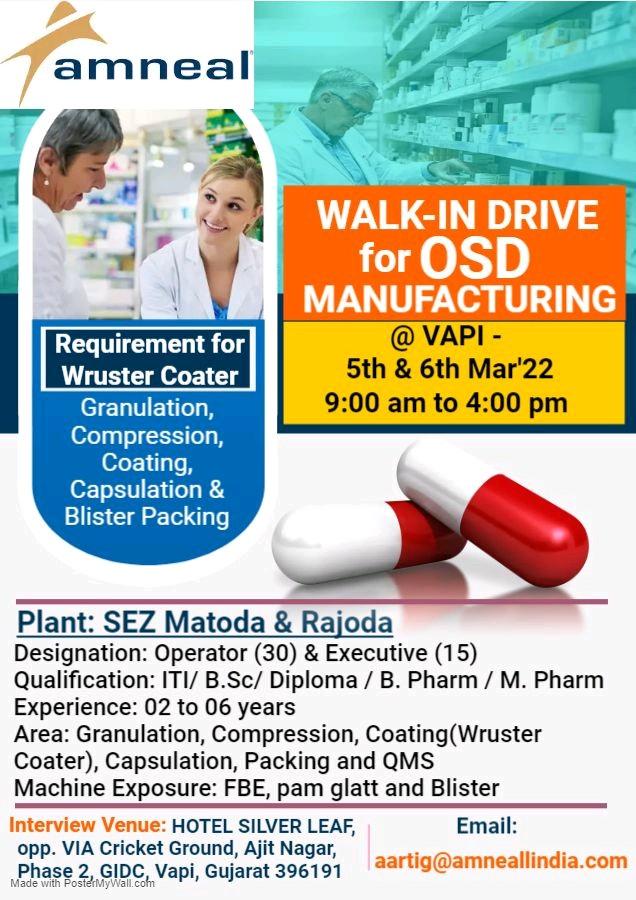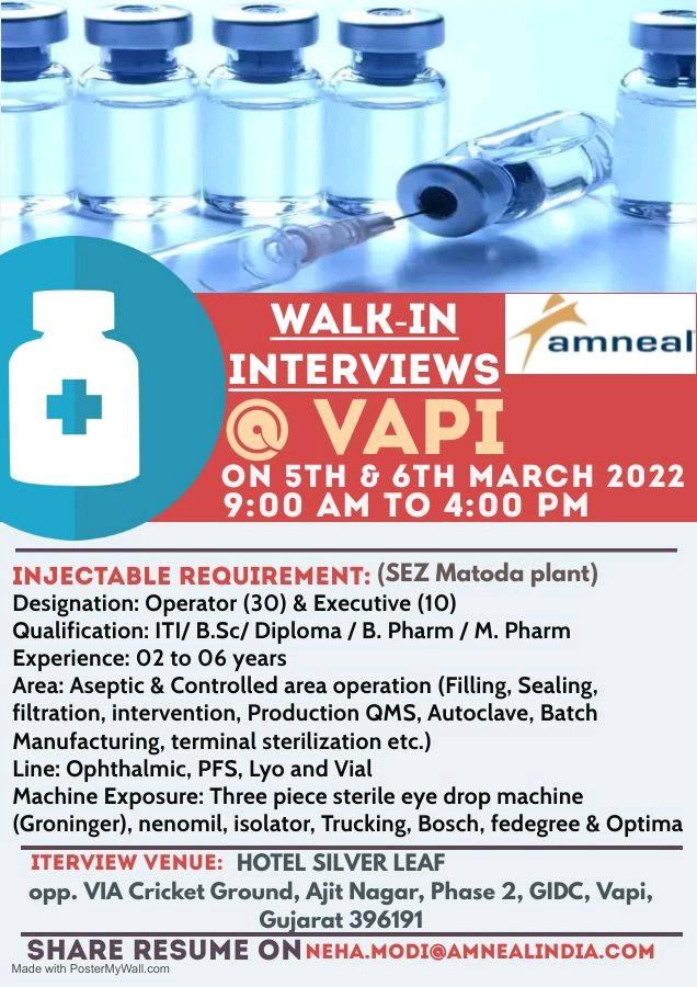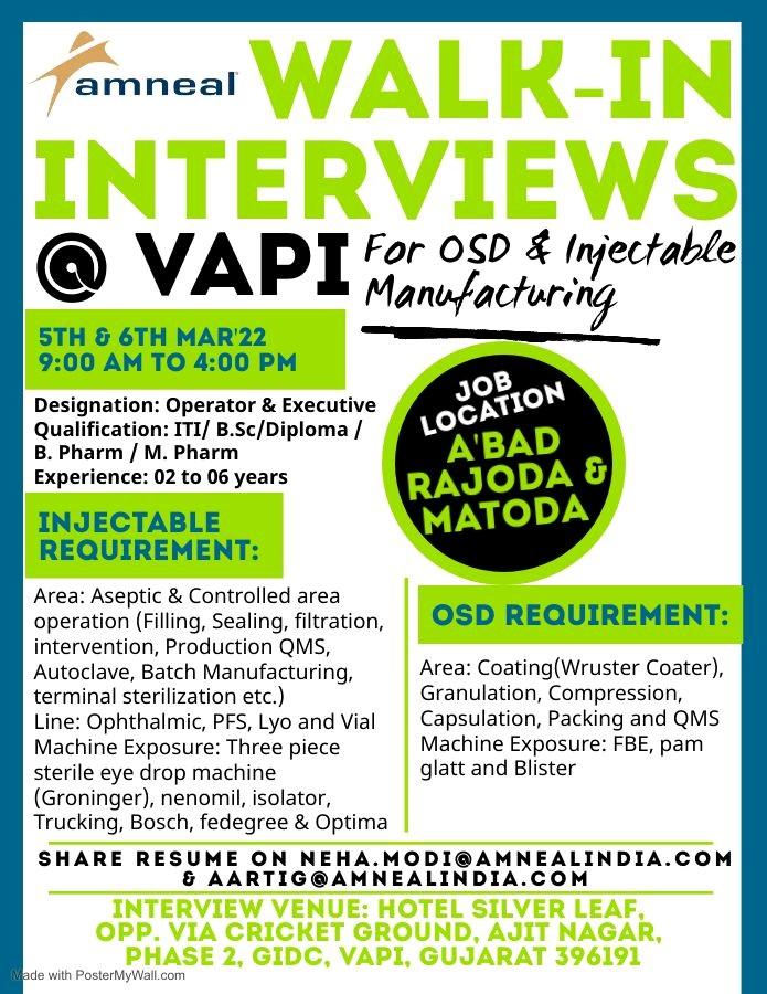 Amneal – Walk-in interviews @ VAPI for OSD & Injectable Manufacturing
