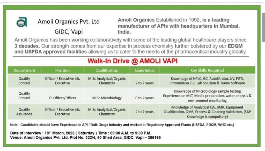 Amoli Organics Pvt. Ltd- Walk-In Interview Drive” on Saturday 18th March 2023