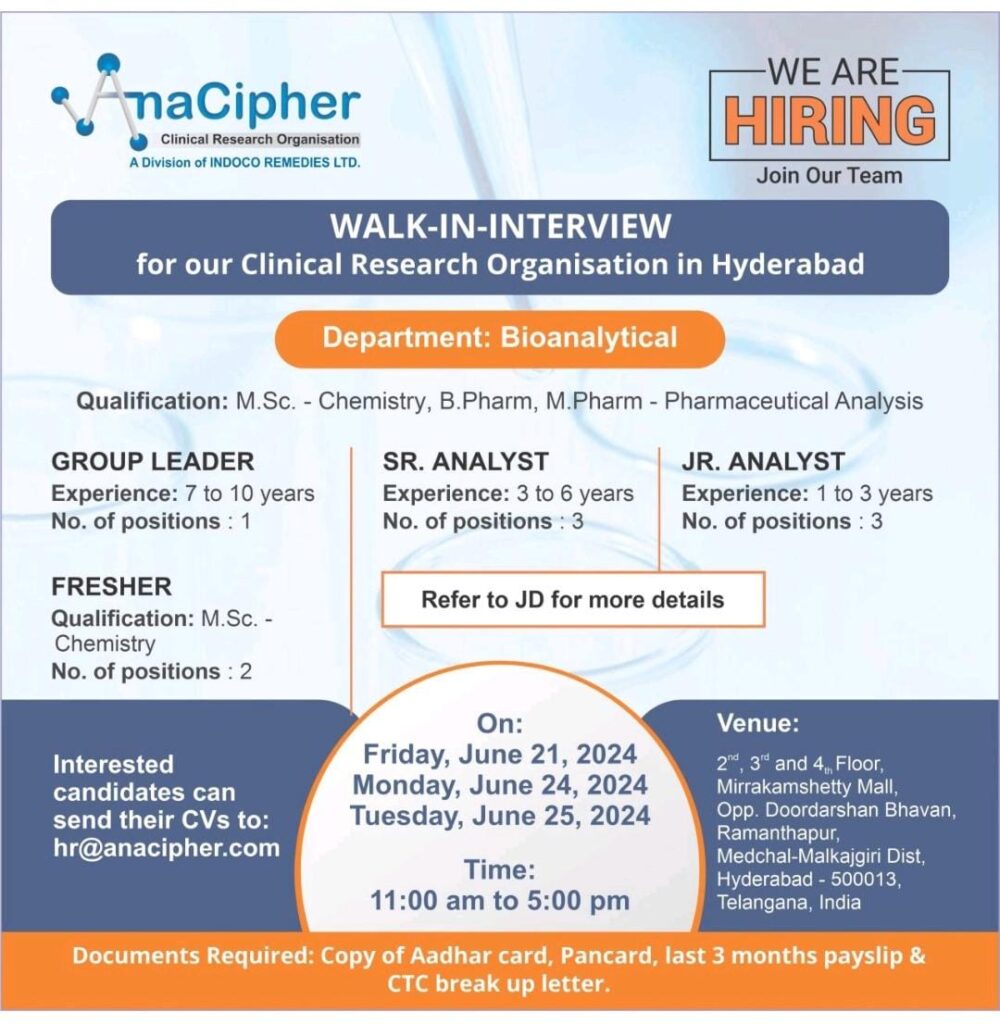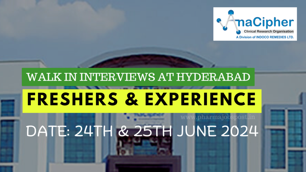 AnaCipher Clinical Research walk in interview for Freshers & experience on 24th & 25th June 2024 at Hyderabad