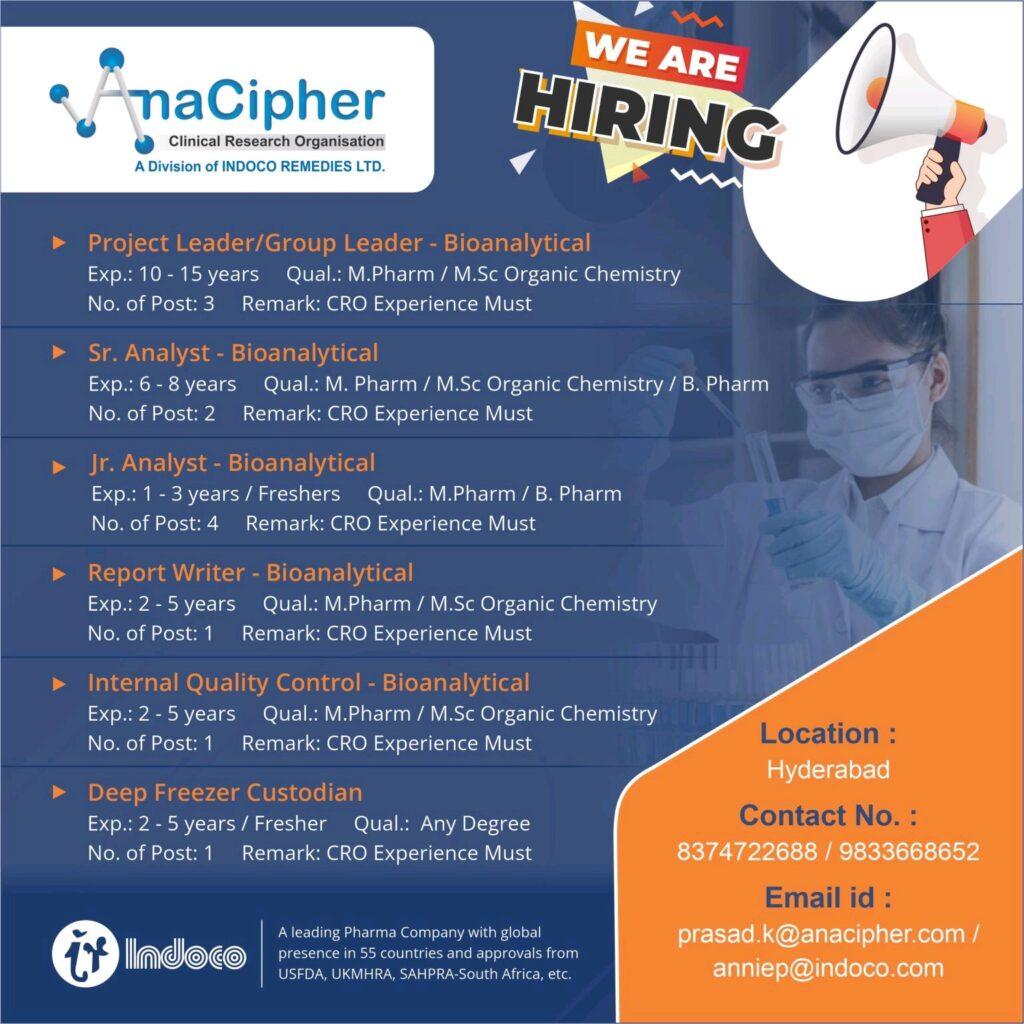 Opportunity to join the Indoco family at our CRO at Hyderabad. Send your CV to prasad.k@anacipher.com and anniep@indoco.com