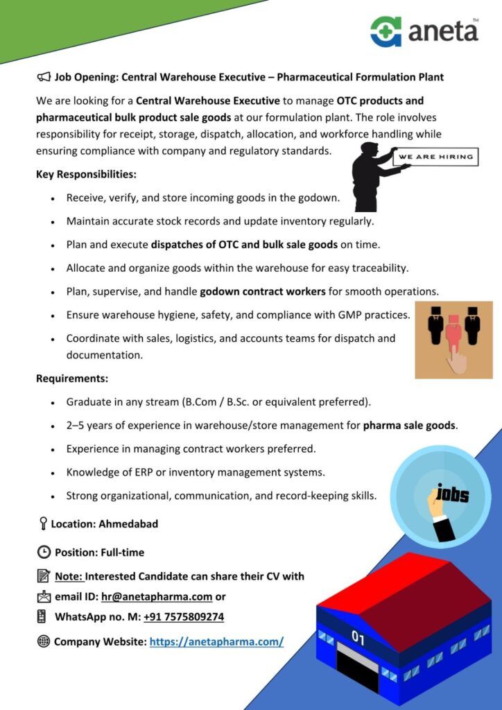 Aneta Pharma has announced an exciting career opportunity for professionals experienced in warehouse and inventory management. The company is looking for a Central Warehouse Executive to oversee OTC products and pharmaceutical bulk sale goods at its formulation plant. This role is crucial in ensuring smooth warehouse operations, compliance, and timely dispatches while maintaining quality standards.