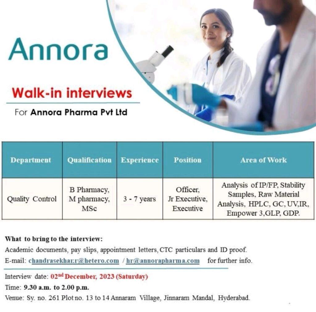 Annora Pharma Pvt Ltd Walk-in interviews for Quality Control on 02nd December, 2023