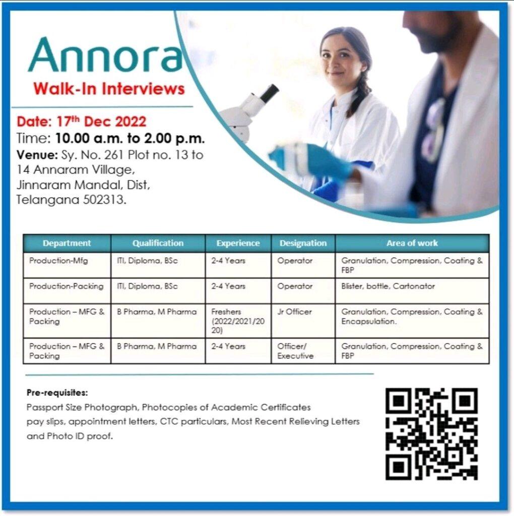 Annora- Walk-In Interviews for Freshers & experience- Production Mfg. & Packing on 17th Dec 2022