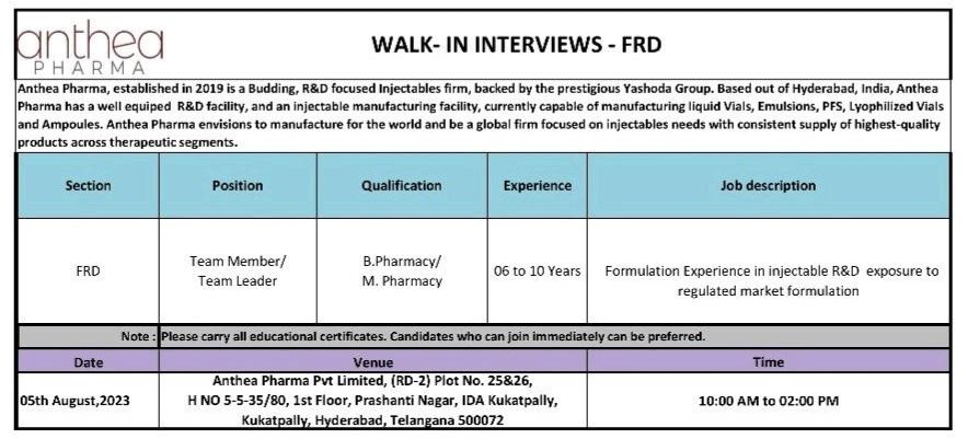 Anthea Pharma, established in 2019 is a Budding, R&D focused Injectables firm, backed by the prestigious Yashoda Group. Based out of Hyderabad, India, Anthea Pharma has a well equiped R&D facility, and an injectable manufacturing facility, currently capable of manufacturing liquid Vials, Emulsions, PFS, Lyophilized Vials and Ampoules. Anthea Pharma envisions to manufacture for the world and be a global firm focused on injectables needs with consistent supply of highest-quality products across therapeutic segments.