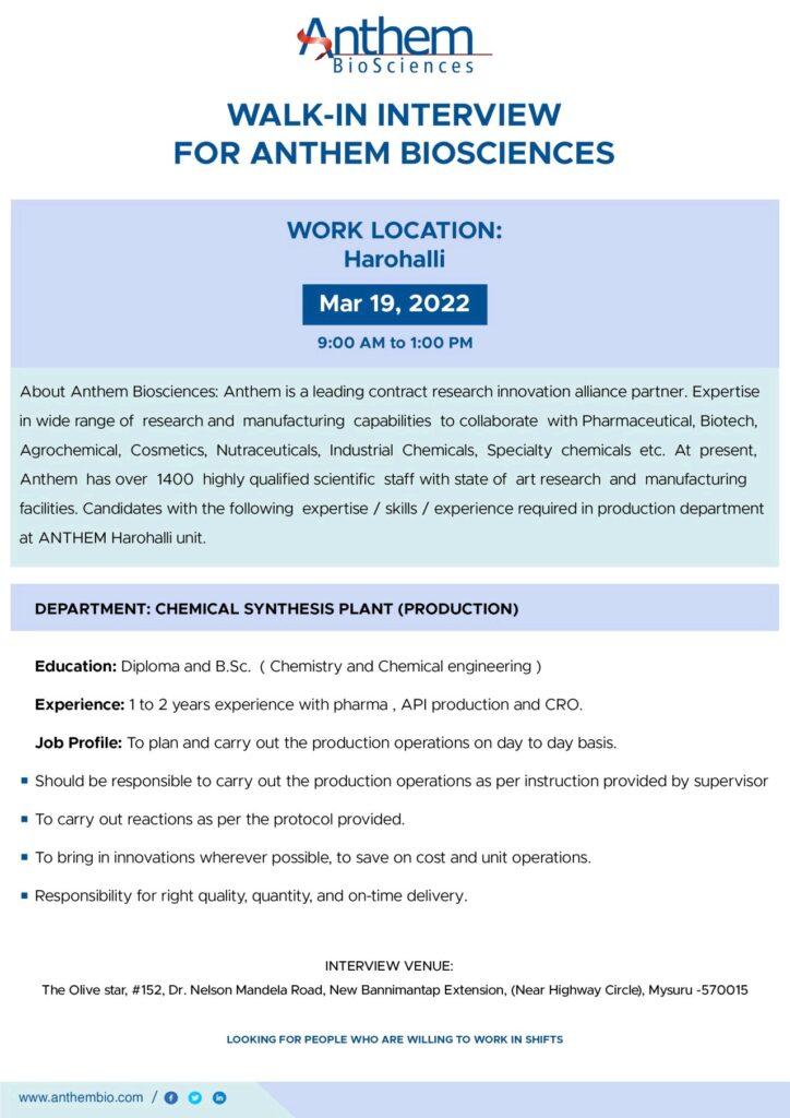Anthem Biosciences Private Limited is conducting a walk-in-interview on March 19th, 2022