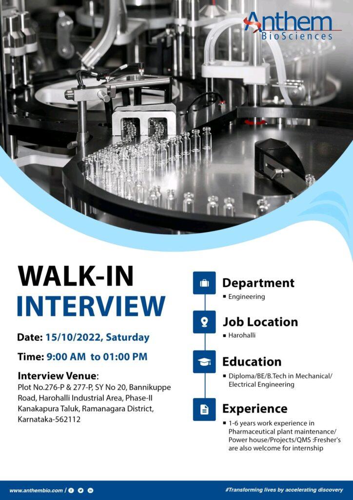 Anthem Biosciences Private Limited Walk In-Interview for Engineering Department on 15/ 10/ 2022